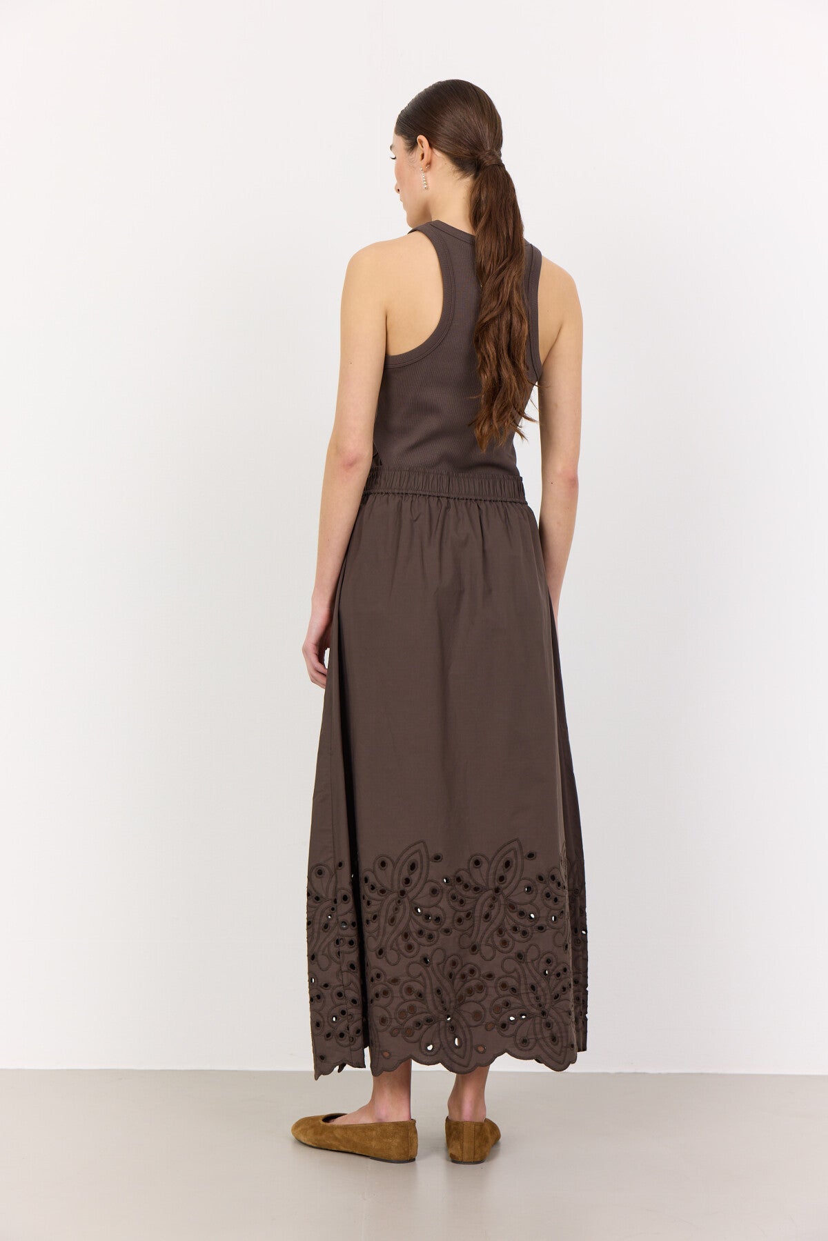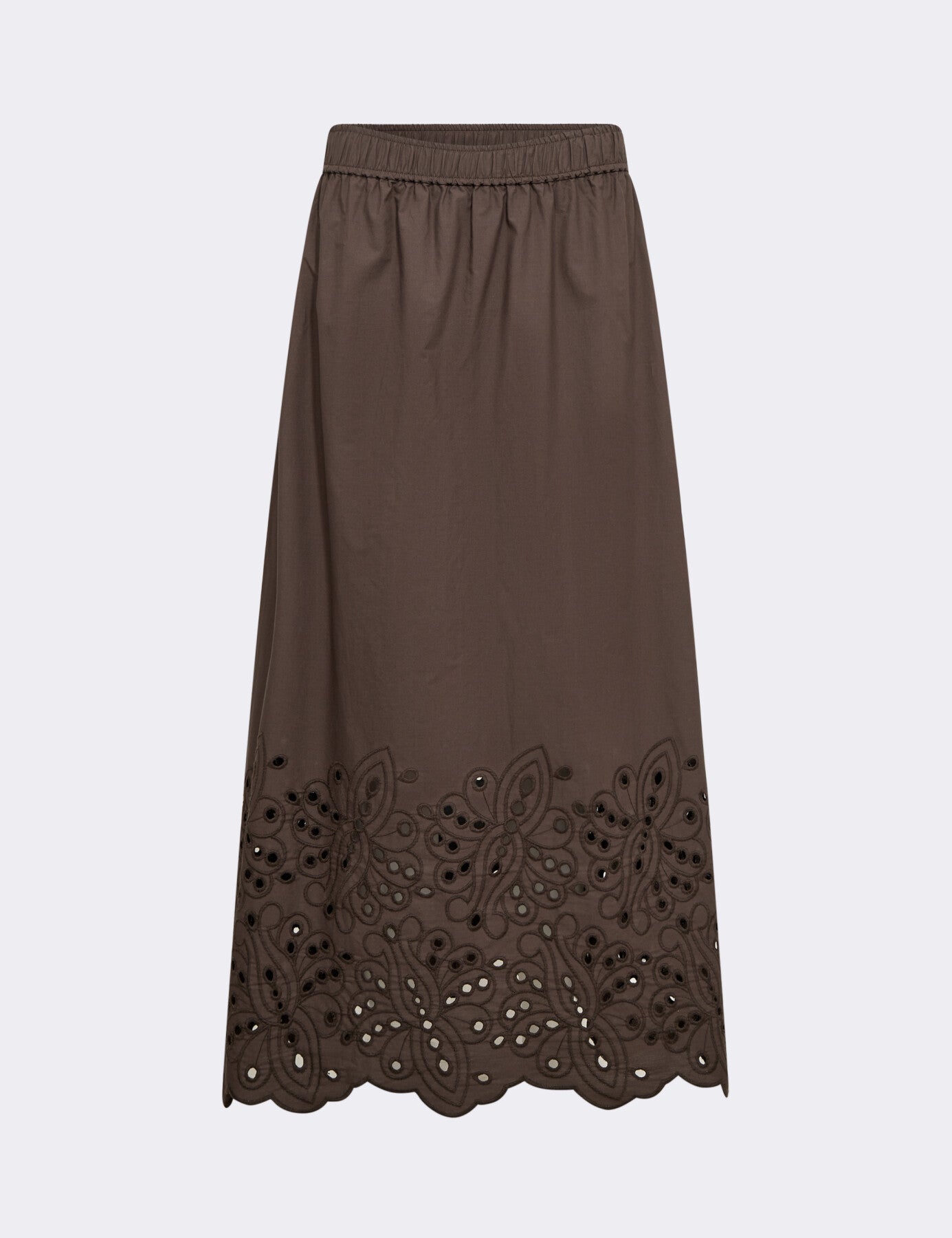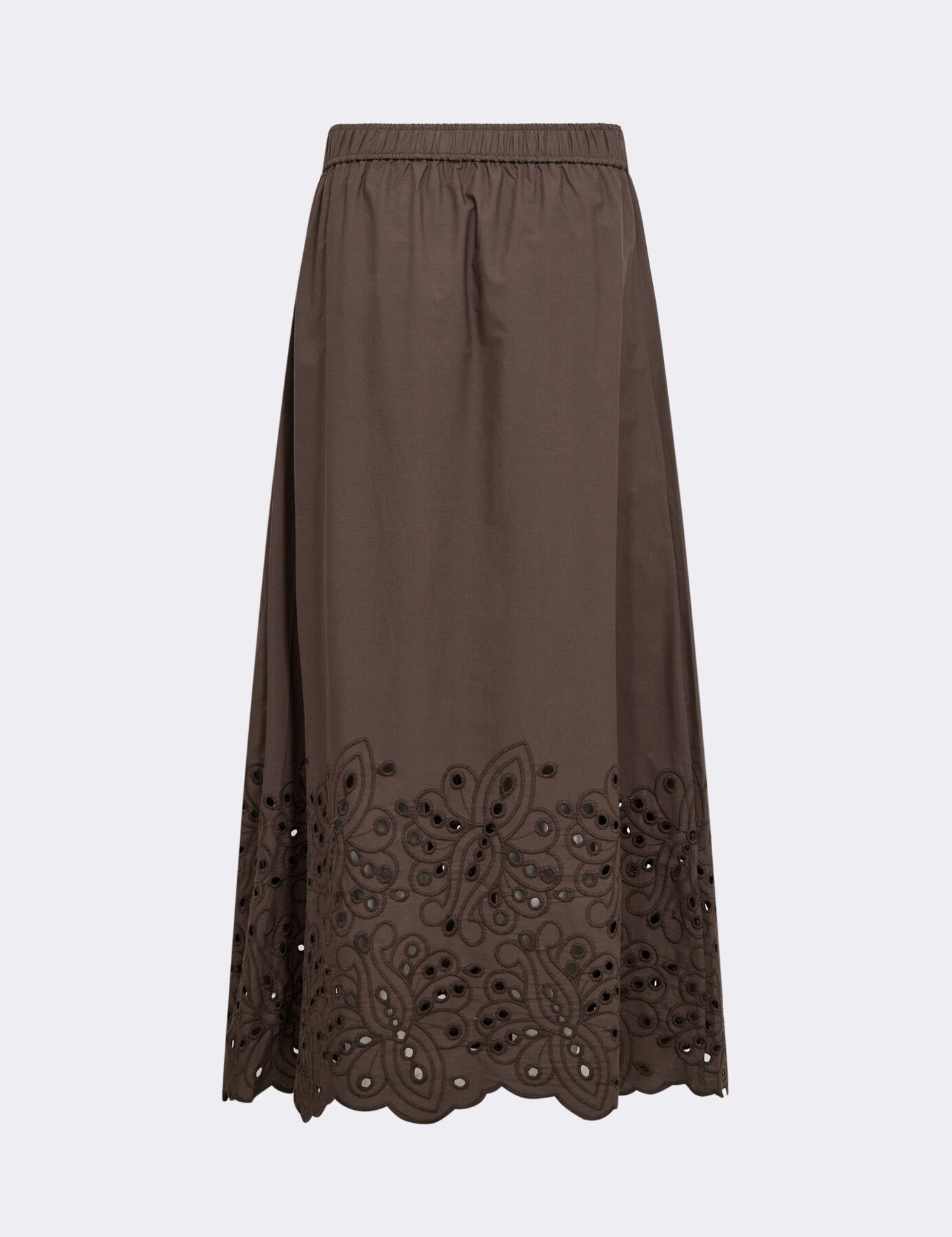 LR-GROLET 5 är en lång kjol tillverkad av 100% ekologisk bomull. Den har ett elastiskt midjeband för en bekväm passform, en maxilängd och broderade anglaise-detaljer längs nederkanten. Styla denna härliga kjol med en tjock stickad tröja och några loafers för en minimalistisk look.